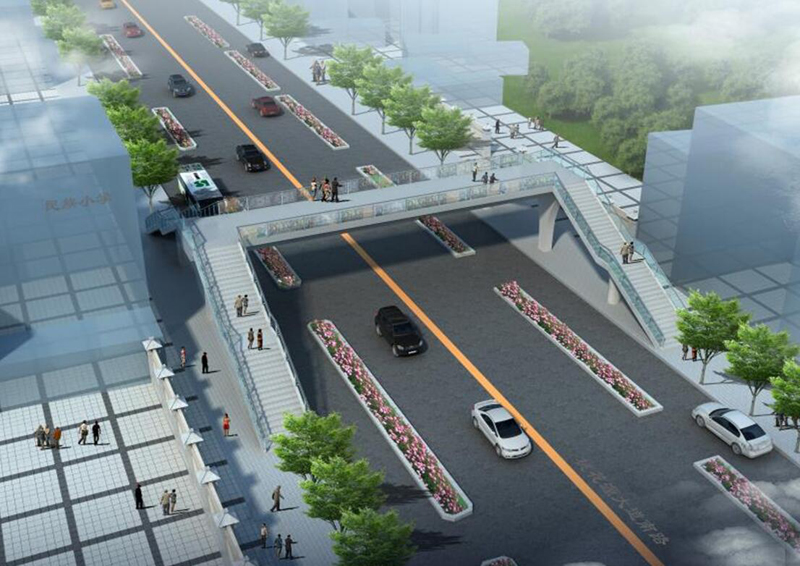 鐘多小學(xué)人行天橋采用“菱”形平面布置,天橋主梁寬度4.2m,凈寬4.0m;梯道寬2.5m,..